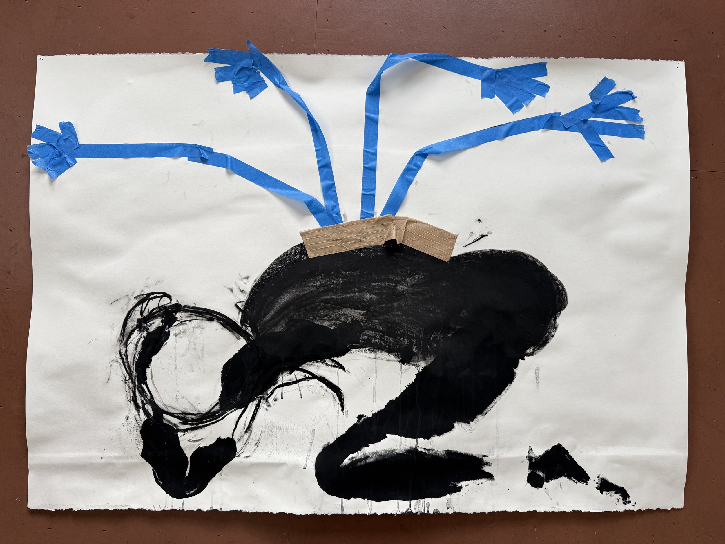 Then something unexpected happened. I had excess paint still on my body, so I grabbed a second piece of paper and began printing each section separately. The result was this piece—body parts brought together by a red joint serving as a spine. I titled it Mother's Backbone.