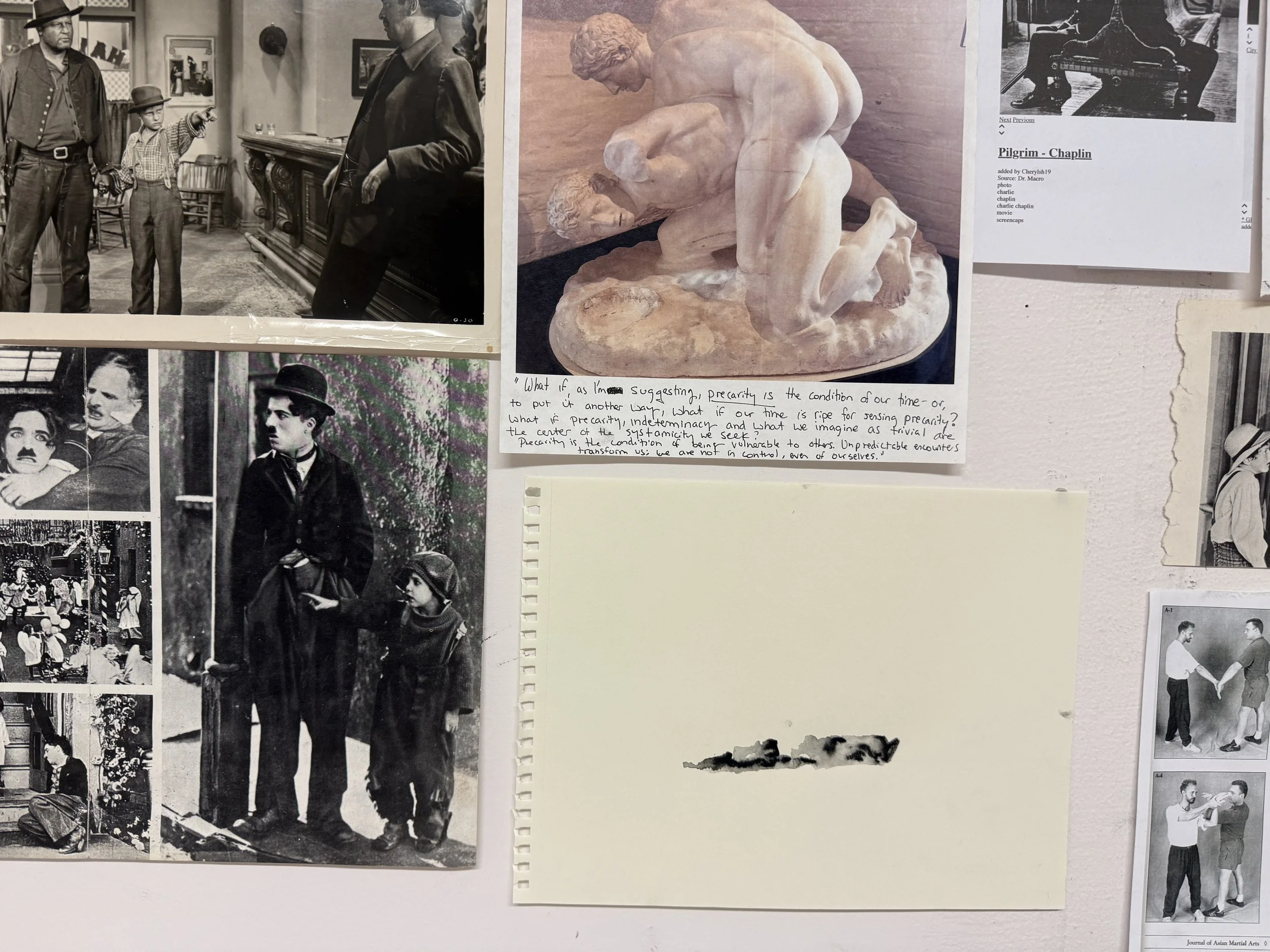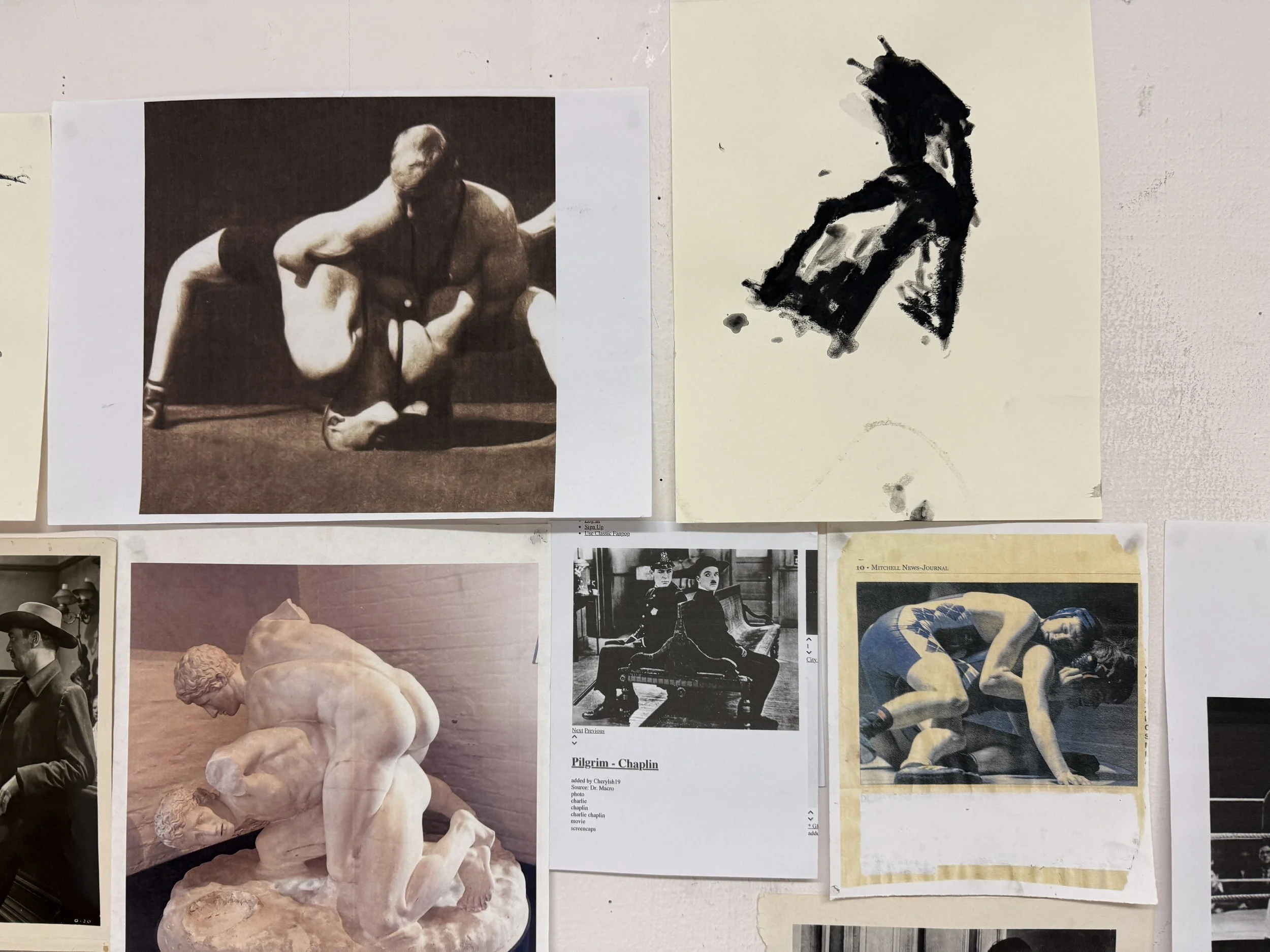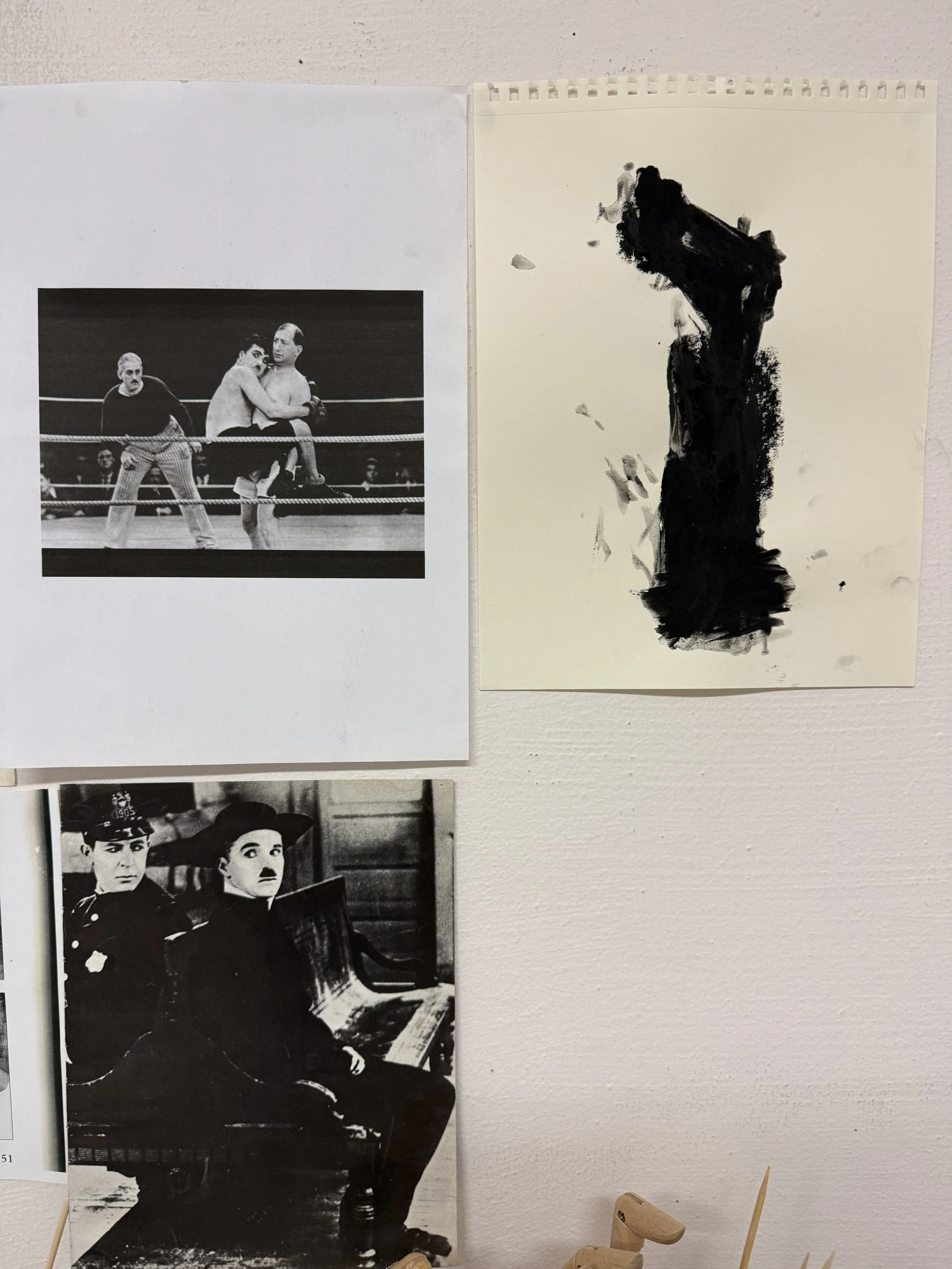 I recently took a sculpture class online with beloved mentors of mine. In preparation I dug up a few old reference materials that have offered me inspiration over the years that still feel relevant as well as felt interesting for thinking about figurative sculpture. Many come from old black and white films, with a particular recurrence of Charlie Chaplin. On one day we did some exercises both drawing and sculpting actions. What does the drawing “squeeze” or the sculpture “tear” look like? My drawings for some of these actions joined my wall of figures and I rather like the conversation between these figures and these abstractions but I am not entirely sure I can describe why. What does having them together do for you or make you think of? What action verb would you guess each drawing represents?